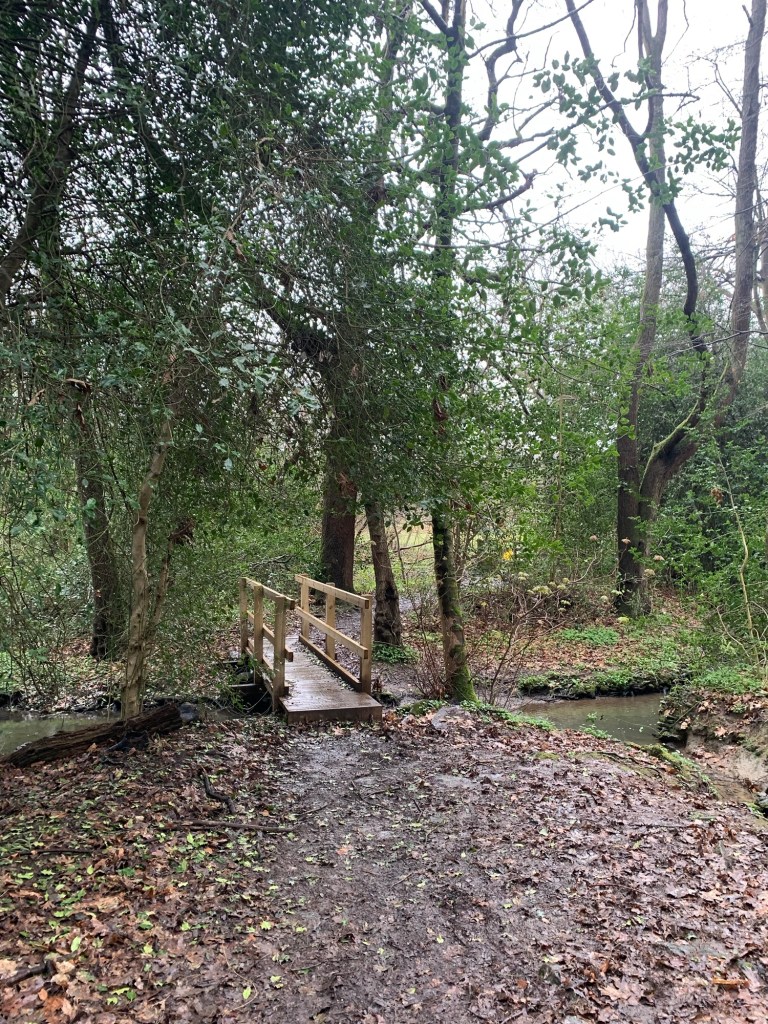 *So instead, we follow the lane to the right which soon becomes a well behaved path. We’re slightly thrown however, when we come to another ford and ( unsurprisingly) take the footbridge rather than wading through the stream. It seems that by doing this we’ve been redirected along the edge of the field and the lovely hollow way we were aiming to follow is just visible next to us through the hedge.