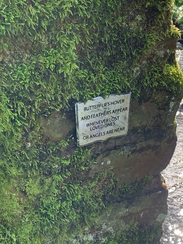In spite of the weather the Millthorpe Brook still looks beautiful today and just as we’re about to cross the footbridge we notice a poignant little poem set into the wall.