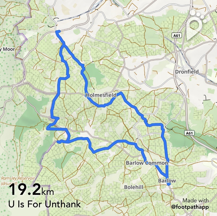 Totley- Fanshaw Gate- Holmesfield Road-Milthorpe Brook-Unthank-( Milthorpe just off route)- Johnnygate- Highlightly- Crowhole-Commonside-Barlow- Cowley- Cartledge Lane- Holmesfield- Woodthorpe Hall-Totley