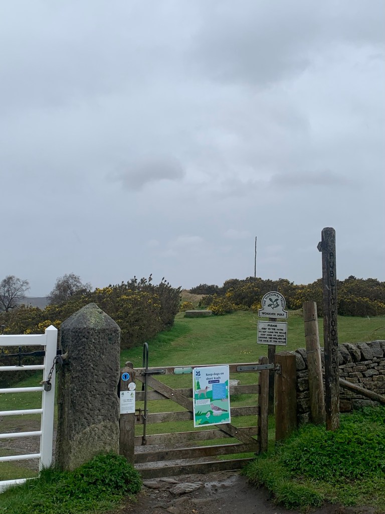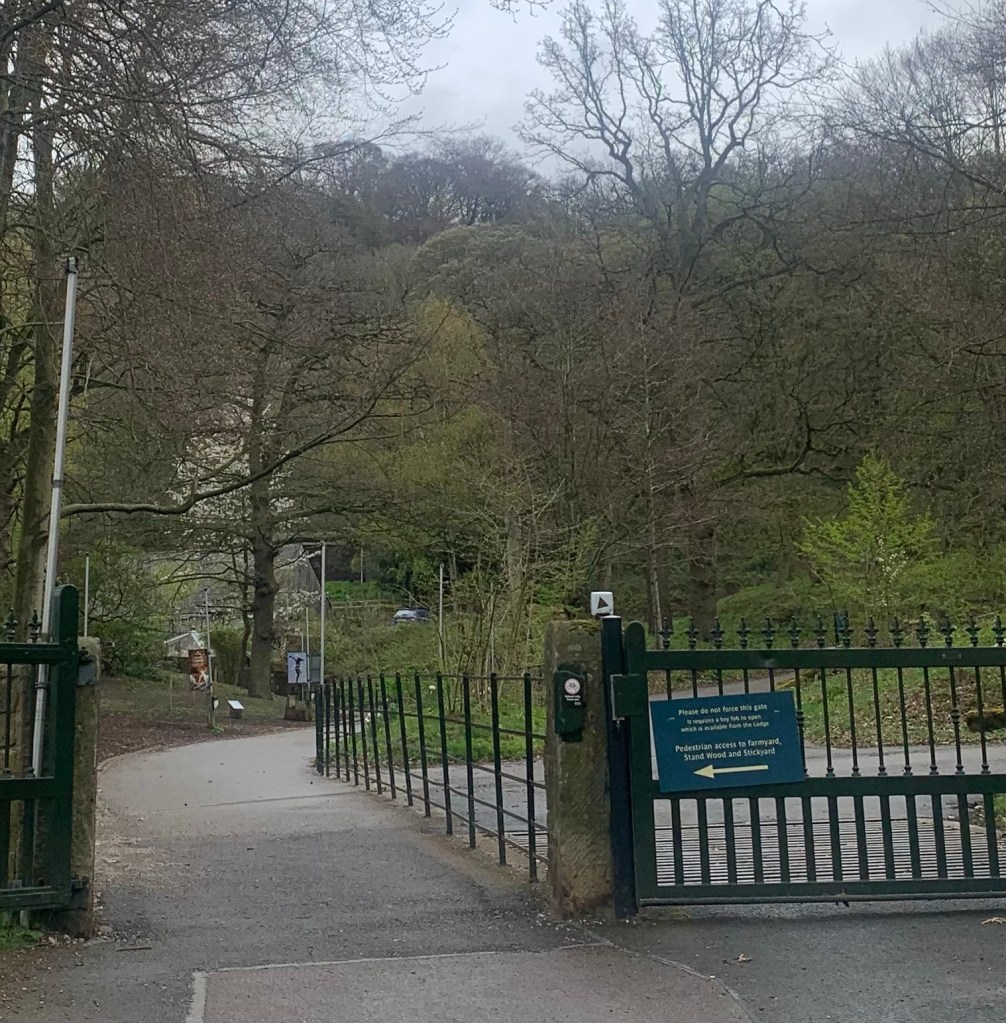 we make our way up through the parked cars towards the entrance to the farmyard and playground but then head right, through the gate signed for Stand Wood.