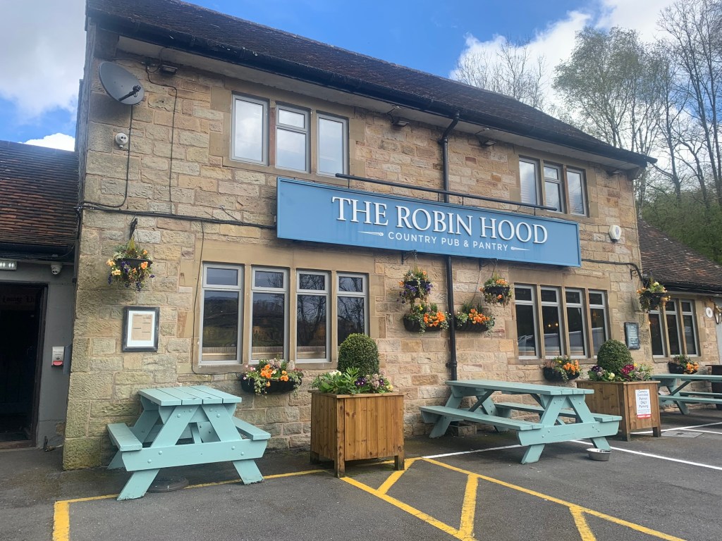 Just past the crags we head off left down a muddy bank to a bridge that takes us over Heathy Lea Brook and then follow steps up the other side onto the A619. We cross the road and continue on the pavement to the right, passing the Eric Byne Memorial Campsite and, hey presto, next thing you know, we’ve arrived at The Robin Hood pub and by total coincidence, just at opening time.