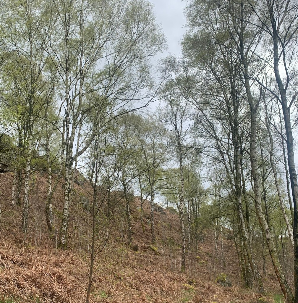 It’s another delightful path through the trees, this time it’s the typical sort of birch tree and mossy boulders type of thing and we soon spot the edge itself and indeed a climber who’s about to ascend it.