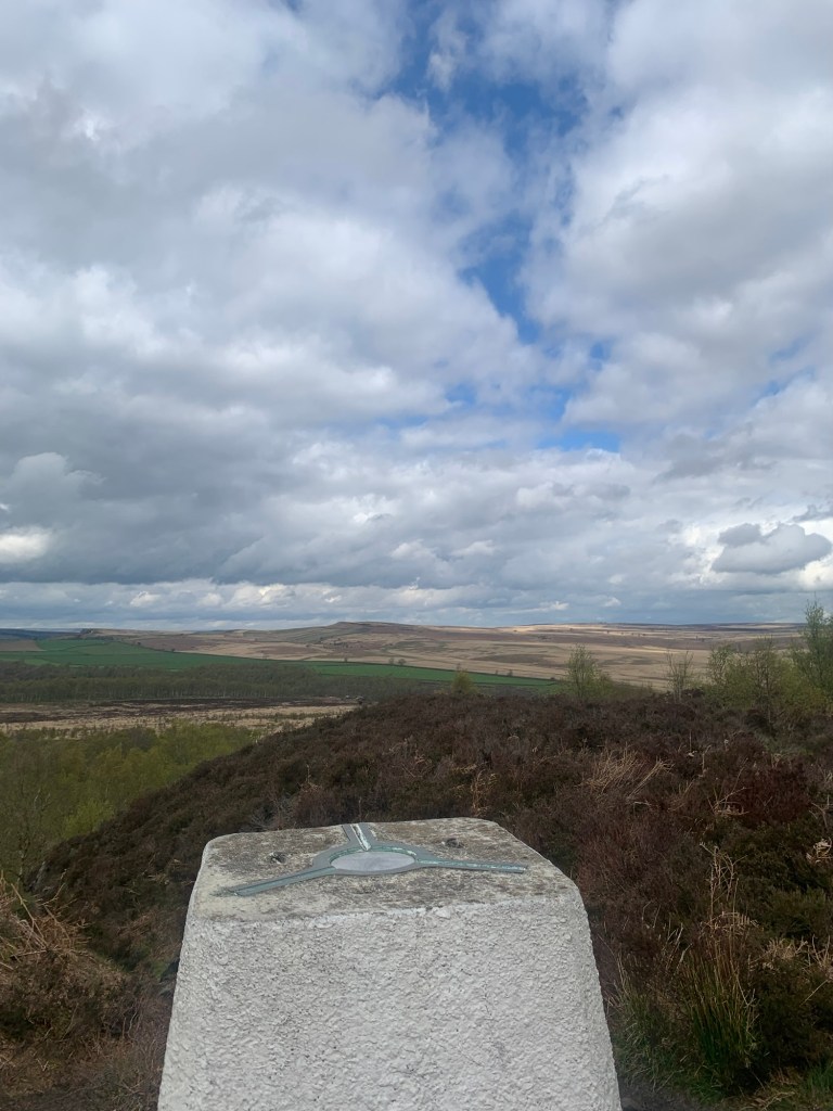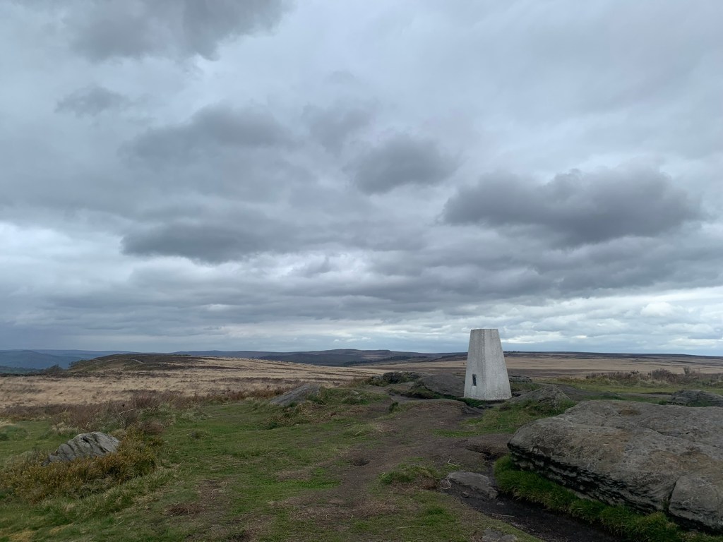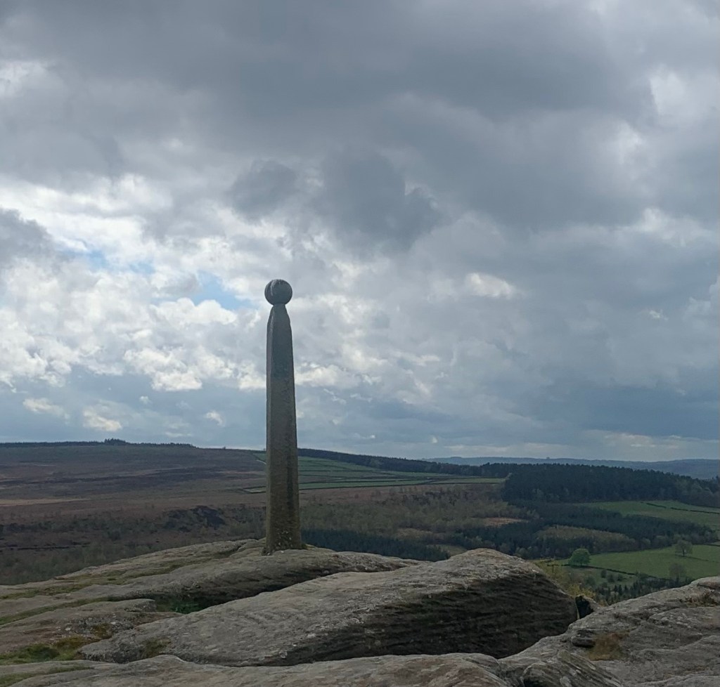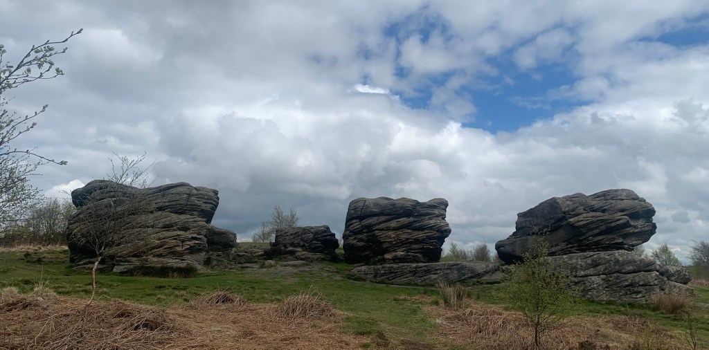 when, on glancing behind at the view, we notice a bank of greyness heading towards us which a few minutes later makes itself felt on our backs as an icy April shower. Progressing along the top of the edge ( but without so much enthusiasm regarding the rocky gritstone scenery now that we’re getting wet) visibility below us still extends as far as The Grouse Inn. We consider taking the next path down but decide to continue along the higher path which leads us to the T junction of the A625 and the B6054 just near the entrance to Longshaw estate and the Wooden Pole.