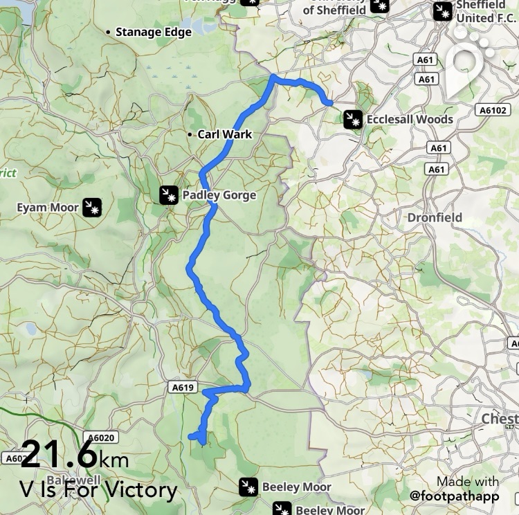 Chatsworth House car park- Stand Wood- Hunting Tower-Dobb Edge-Chatsworth Edge-Robin Hood- Birchen Edge-Clodhall Lane crossroads-White Moor- Longshaw- Fox House- ( Houndkirk Moor Road- Whirlow Park- Hathersage Road)