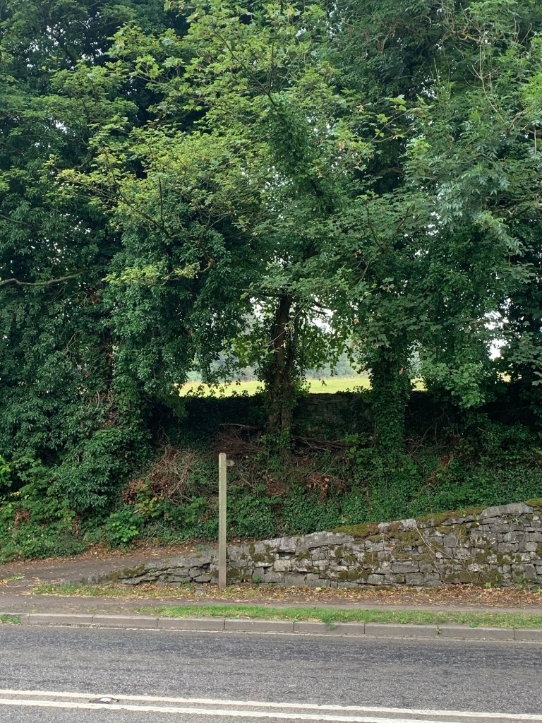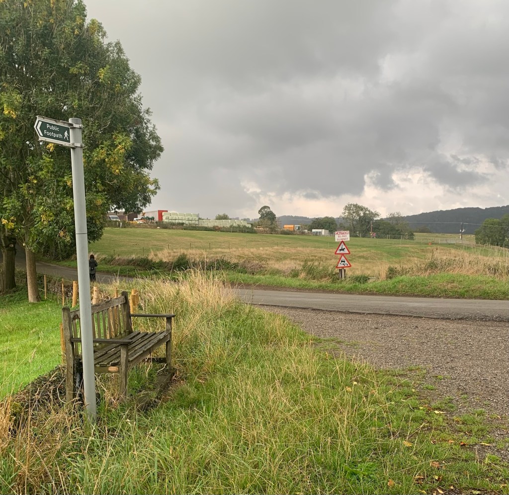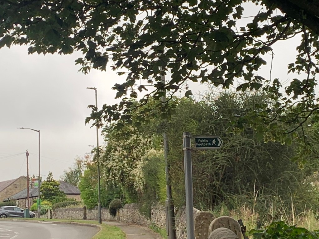 until we reach the footpath sign pointing straight ahead as the road bends left.